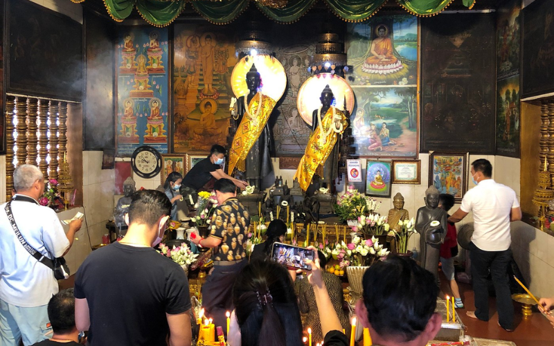 ▪️ Continuaremos pedalando para visitar pagodas locais, como a Wat Phour Leu, e seguiremos pela estrada de 60 metros até o mercado de alimentos, onde você poderá experimentar comidas típicas, como carne de vaca, frango e peixe assados, além de iguarias exóticas, como grilos.