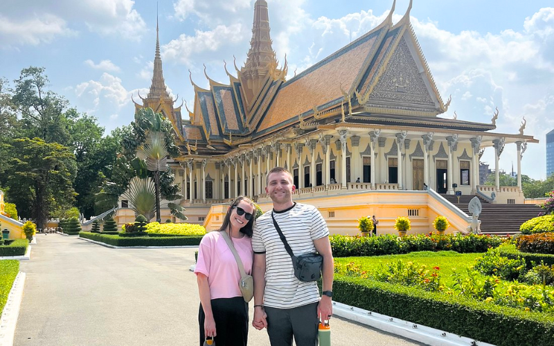 ▪️ Seguiremos para o Palácio Real, construído pelo Rei Norodom em 1866 no local da antiga cidade, e a Pagoda de Prata. Localizada nos jardins do Palácio Real, a Pagoda de Prata recebeu esse nome por conta do seu piso, composto por 5.000 ladrilhos de prata. Entre os tesouros em seu interior estão um Buda de ouro maciço, incrustado de diamantes, pesando 90 quilos, e um pequeno Buda de esmeralda e cristal baccarat do século XVII.