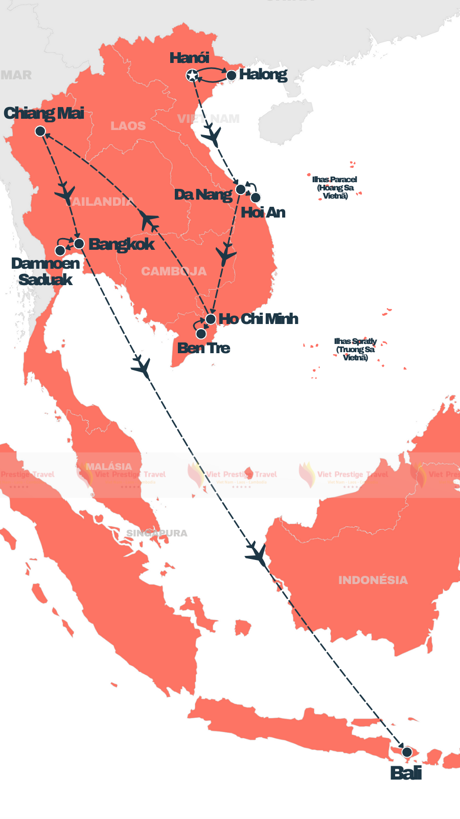 Vivencie uma jornada de 16 dias pelo Vietnã, Bali e Tailândia! Passeie por Hanói, faça um cruzeiro na Baía de Halong, conheça Hoi An, Cidade de Ho Chi Minh e o Delta do Mekong. Em Tailândia, visite Chiang Mai, Bangkok, o Mercado Flutuante Damnoen Saduak e os templos Tirta Empul e Tanah Lot. Viet Prestige Travel, sua empresa confiável no Vietnã, oferece uma experiência inesquecível!