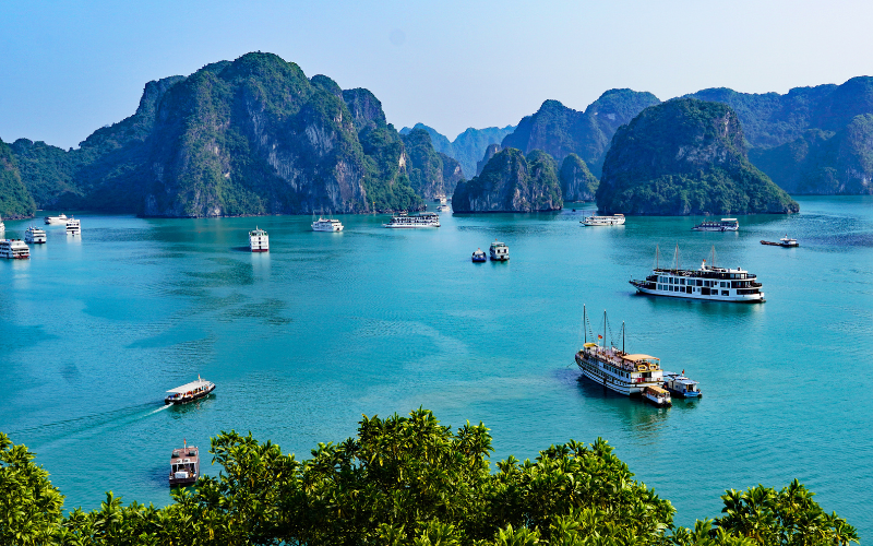 - Cruzeiro na Baía de Halong: Navegue por paisagens deslumbrantes de formações rochosas e ilhas exóticas, desfrutando de um cruzeiro relaxante e refeições a bordo.