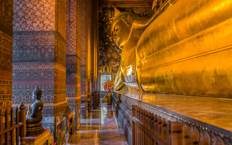 Wat Pho▪️ Participe deste tour guiado privado e explore dois mercados fascinantes: o Mercado Ferroviário Mae Klong e o Mercado Flutuante Damnoen Saduak!