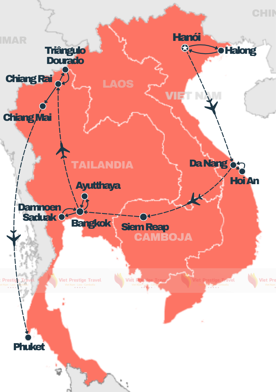 Viva uma experiência única de 20 dias pelo Sudeste Asiático, passando por destinos fascinantes como Hanói, Baía de Halong, Da Nang, Hoi An, Siem Reap, Angkor Thom, Ta Prohm, Angkor Wat, Bangkok, Chiang Rai, Chiang Mai e Phuket. Com a Viet Prestige Travel, empresa local confiável no Vietnã, aproveite serviços de excelência e uma jornada inesquecível.