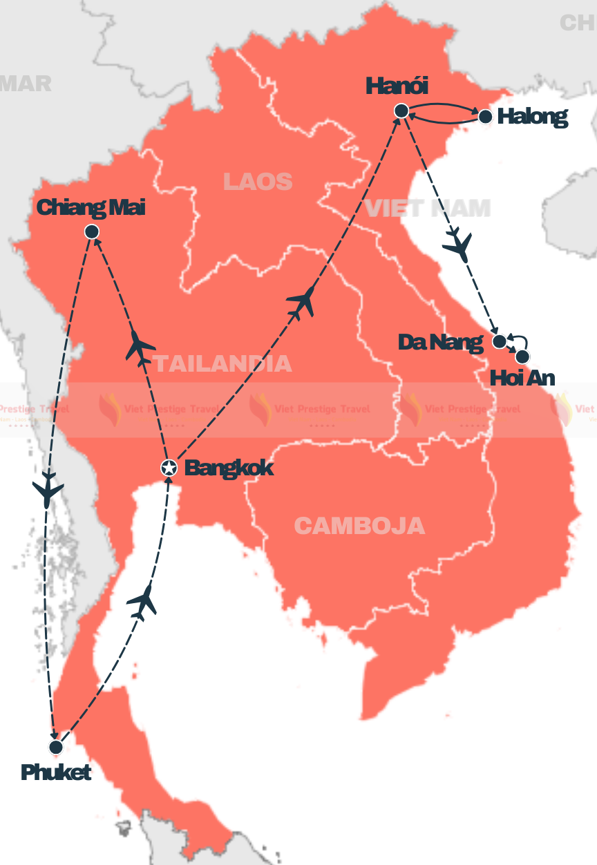 Desfrute de uma incrível viagem de 13 dias pelo Vietnã e Tailândia, explorando destinos como Bangkok, Chiang Mai, Phuket, Hanói, Baía de Halong, Hoi An e Da Nang. Aventure-se por paisagens deslumbrantes e rica cultura local com a Viet Prestige Travel, uma empresa confiável e especializada em experiências autênticas no Vietnã. Descubra o melhor da Ásia com conforto e segurança garantidos!