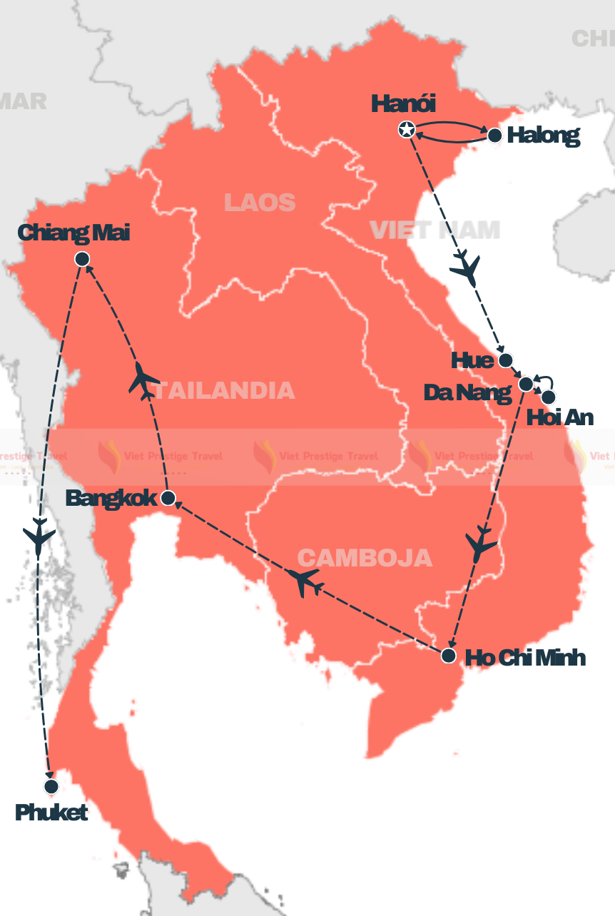 O tour oferece uma incrível jornada por Vietnã e Tailândia. Descubra a rica história de Hanói e Hue, explore a beleza natural de Halong e Phuket, caminhe pelas ruas encantadoras de Hoi An, e mergulhe na vibrante energia de Ho Chi Minh e Bangkok. Finalize com a serenidade cultural de Chiang Mai. Uma aventura perfeita combinando história, cultura e natureza deslumbrante.