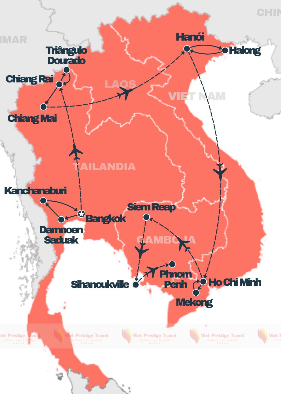 Hanói - Ninh Binh - Baía de Halong - Hue - Hoi An - Da Nang - Siem Reap - Bangkok - Ayutthaya - Chiang Mai - Phuket
