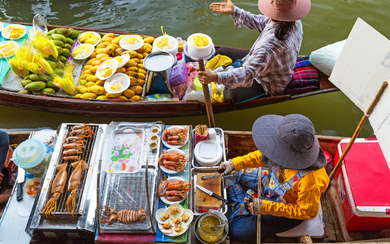 Mercado Flutuante Damnoen Saduak▪️ Após o café da manhã, aproveite seu tempo livre enquanto aguarda nosso guia turístico, que irá buscá-lo no hotel para levá-lo ao aeroporto. Você embarcará em um voo de aproximadamente 75 minutos com destino a Chiang Rai.
