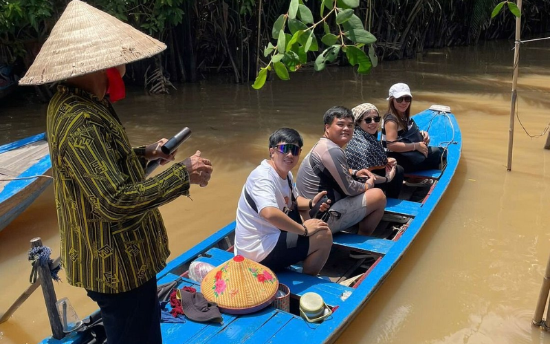 ▪️ Por volta das 10h, você chegará ao Cais de Cai Be, onde será recebido pela tripulação com toalhas frias e uma bebida refrescante. Em seguida, embarcará no sampan Cai Be Princess para um passeio relaxante pelos movimentados canais do delta. O tráfego de barcos no rio é constante, oferecendo uma visão autêntica da vida local.