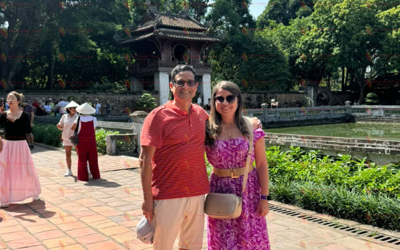 Turistas da empresa Viet Prestige Travel no Templo da Literatura▪️ Pela manhã, após o café da manhã, nosso motorista irá buscá-lo por volta das 8h para levá-lo ao porto de cruzeiros na Baía de Halong. A viagem dura cerca de 3 horas. Ao chegar, por volta do meio-dia, a equipe do cruzeiro estará pronta para ajudá-lo com o check-in.