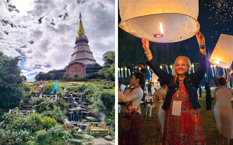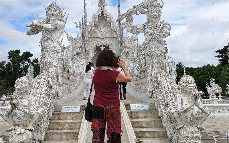 Turistas da Viet Prestige Travel no Templo Branco em Chiang Mai - ▪️ Pela manhã, leva cerca de 2 horas para chegar ao pico mais alto da Tailândia, no Parque Nacional Doi Inthanon.▪️ Ao chegar, siga por uma trilha estreita na montanha durante uma caminhada na selva de 2 a 3 horas, levando a uma cachoeira escondida em meio à exuberante floresta. Ao longo do caminho, antes de chegar à vila da tribo das colinas de Pagagayaw Karen, passaremos por plantações de café, fazendas de flores e belos terraços de arroz. Você terá a oportunidade de explorar a vila da tribo das colinas Karen de Pagagayaw e saborear uma xícara de café cultivado localmente. Em seguida, iremos para a Cachoeira Vachiratharn, uma cachoeira poderosa de 70 metros de altura.▪️ Depois, você poderá admirar a esplêndida arquitetura de Nopamaytanidol Chidi e Phra Mahatat Nopaphon Bhumisiri, ambas construídas para comemorar o 60º aniversário do Rei Bhumipol e da Rainha Sirikit.▪️ Finalmente, retornaremos a Chiang Mai para a noite.