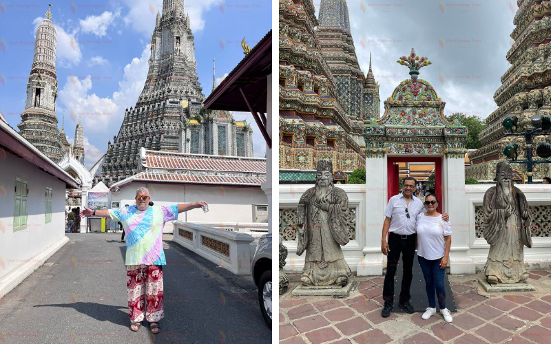 Turistas da Viet Prestige Travel em Wat Pho e Wat Arun - ▪️ Saída cedo para visitar o mercado Maeklong, localizado nos trilhos de trem, muito perto do terminal ferroviário. Caminhe pelos trilhos para explorar o mercado vibrante e testemunhe a rapidez com que os comerciantes desmontam suas barracas em preparação para a passagem do trem, programada para passar por volta das 8h30.▪️ Em seguida, siga para o pequeno mercado de Samut Songkhran, onde você embarcará em um belo passeio de canoa ao longo do Grande Canal e depois por canais menores, proporcionando uma autêntica visão da Ásia rural nos arredores de Bangkok. O passeio de aproximadamente uma hora culminará no coração do mercado flutuante de Damnoen Saduak.▪️ Retorne a Bangkok e aproveite algum tempo livre para relaxar. Pernoite em Bangkok.