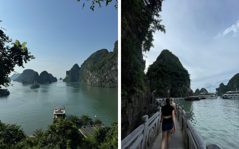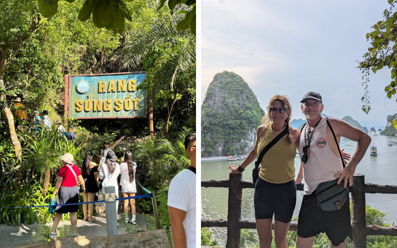 Turistas da Viet Prestige Travel em Hanói - ▪️ Nosso motorista irá buscá-lo no hotel para uma viagem de 3,5 horas até a Baía de Halong - o Patrimônio Natural Mundial reconhecido pela UNESCO duas vezes.▪️ Ao chegar, embarque no cruzeiro e aproveite um drinque de boas-vindas enquanto recebe as instruções do passeio. Um delicioso almoço será servido a bordo enquanto o navio navega pela baía, dando-lhe tempo para admirar as dramáticas ilhas de calcário.▪️ Você pode relaxar no convés ou descansar em sua cabine. À tarde, você terá tempo para nadar nas águas quentes e calmas ou explorar a baía de caiaque. Após uma hora de exploração, retornaremos ao cruzeiro para relaxar antes de participar da aula de culinária no final da tarde.▪️ Desfrute de um jantar incrível e pernoite a bordo.