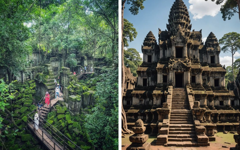 Turistas em Siem Reap - ▪️ Partida para um dia inteiro em Koh Ker e Beng Mealea, ambos localizados nas belas áreas rurais de Siem Reap. Viaje por caminhos menos percorridos por cerca de 2,5 horas até Koh Ker, a antiga capital do Império Khmer entre 928 e 944 d.C.▪️ Parcialmente coberto pela floresta e habitado apenas por pássaros, este templo e seus arredores oferecem uma experiência excepcional.▪️ Almoço próximo ao templo e continue a visita a outras estruturas antigas na área tranquila.▪️ No caminho de volta a Siem Reap, visite as ruínas espetaculares de Beng Mealea, construídas pelo Rei Suryavarman II (1113-1150). Diferente de Angkor, há poucas esculturas ou baixos-relevos evidentes. Hoje, o templo está coberto pela vegetação e as paredes de pedra estão desmoronando, o que adiciona um charme único. Após a visita, viagem de 1,5 hora de volta ao hotel.▪️ Pernoite em Siem Reap.