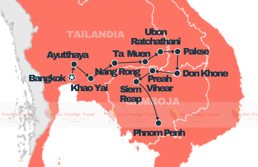 Desfrute Bangkok, Ayutthaya, o Parque Nacional de Khao Yai, e a Aldeia de Tecelagem de Seda na Tailândia. Descubra Angkor Wat, o Lago Tonle Sap e Phnom Penh no Camboja. Com a confiança e experiência da Viet Prestige Travel, uma empresa local de prestígio no Vietnã, vivencie uma jornada inesquecível com qualidade e segurança.