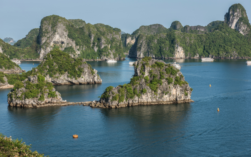- Baía de Halong: Patrimônio da UNESCO, famosa por suas águas verdes e milhares de ilhas calcárias. Cruzeiros são populares para explorar cavernas e vilarejos flutuantes.