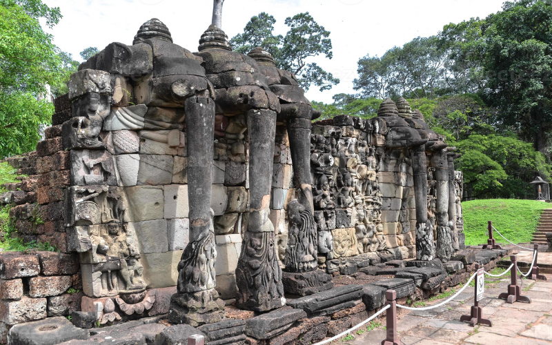 Terraço dos Elefantes em Siem Reap▪️ Café da manhã. Partida para visitar os monumentos do grande circuito de Preak Khen, Neak Pean e Tasom. Almoço em um restaurante local. À tarde, visita aos templos Mébon Oriental, Pré-Roup e Banteay Samre.