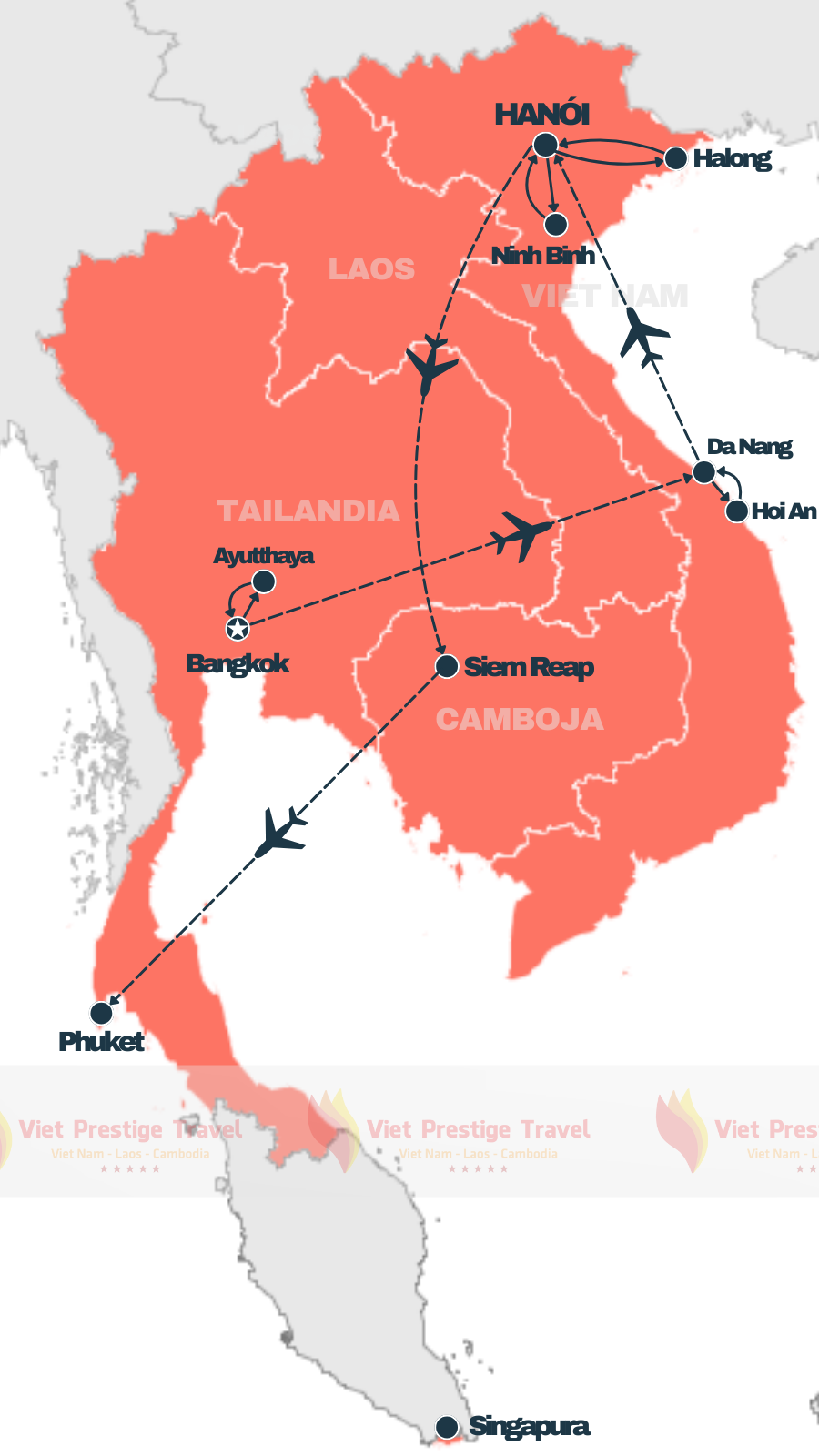 Hanói - Ninh Binh - Baía de Halong - Hue - Hoi An - Da Nang - Siem Reap - Bangkok - Ayutthaya - Chiang Mai - Phuket