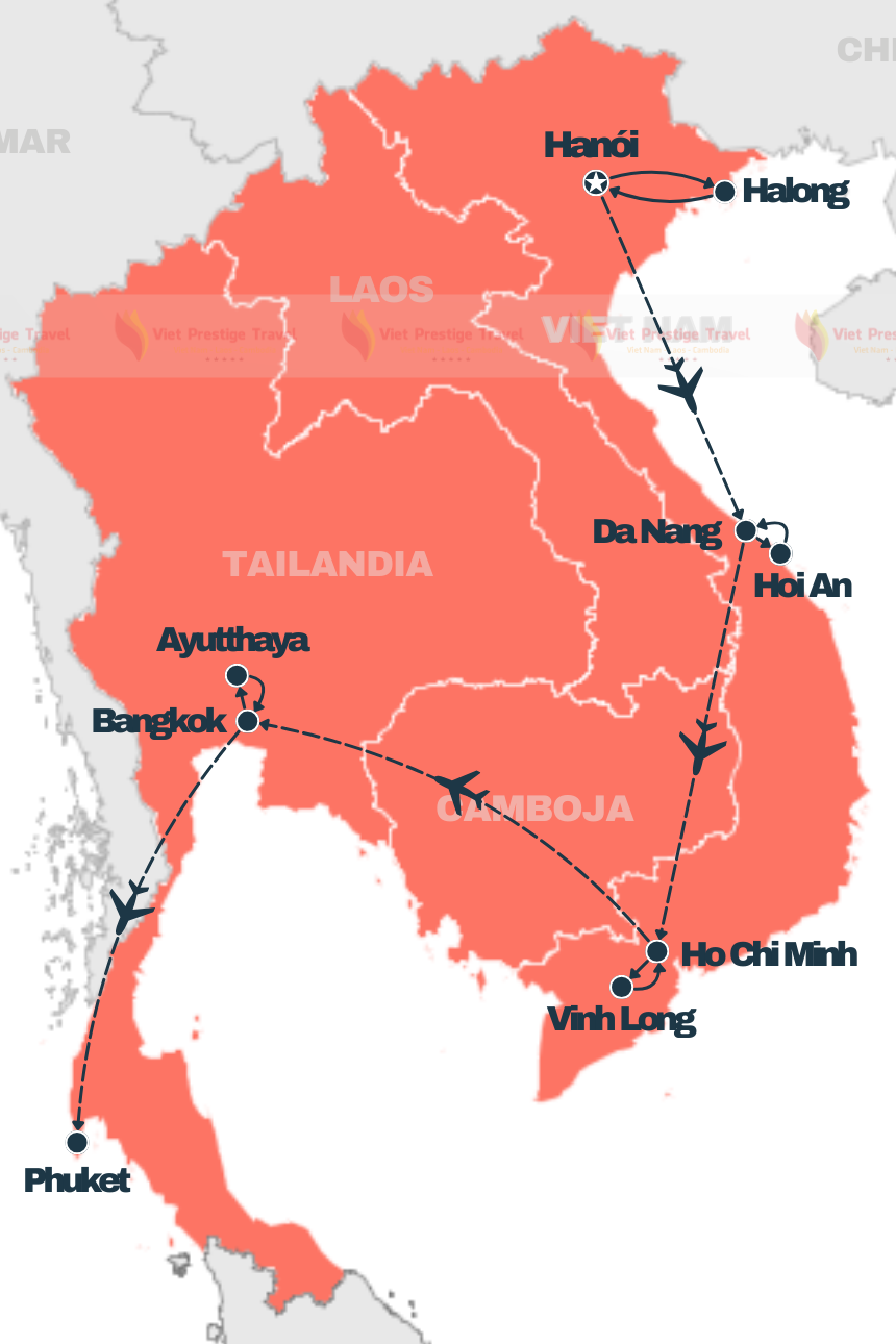 Descubra a joia do Sudeste Asiático: Vietnã e Tailândia com este tour de 15 dias. Explore Hanói e a majestosa Baía de Halong, seguidos pelas charmosas cidades de Da Nang e Hoi An. Em seguida, mergulhe na história da Cidade de Ho Chi Minh, os túneis de Cu Chi e o Delta do Mekong. Depois, siga para a vibrante Bangkok, as ruínas de Ayutthaya e relaxe nas paradisíacas praias de Phuket. Uma experiência inesquecível entre cultura, natureza e história!