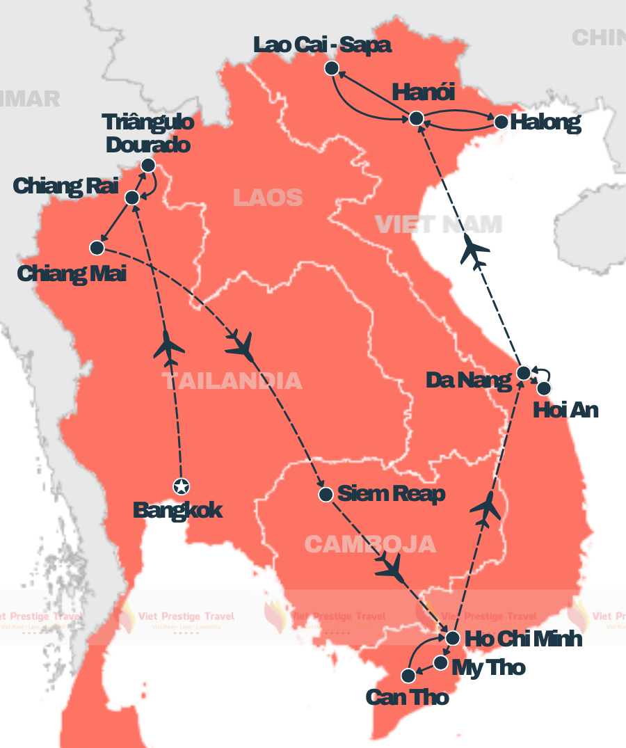 Embarque em uma jornada pelo Sudeste Asiático, começando pela vibrante Bangkok e os templos históricos de Chiang Mai, na Tailândia. Explore os impressionantes templos de Siem Reap, no Camboja, e siga para a dinâmica Ho Chi Minh e o Delta do Mekong, no Vietnã. Visite a charmosa Hoi An, a capital histórica Hanói, a deslumbrante Baía de Halong, e finalize nas montanhas fascinantes de Sapa.