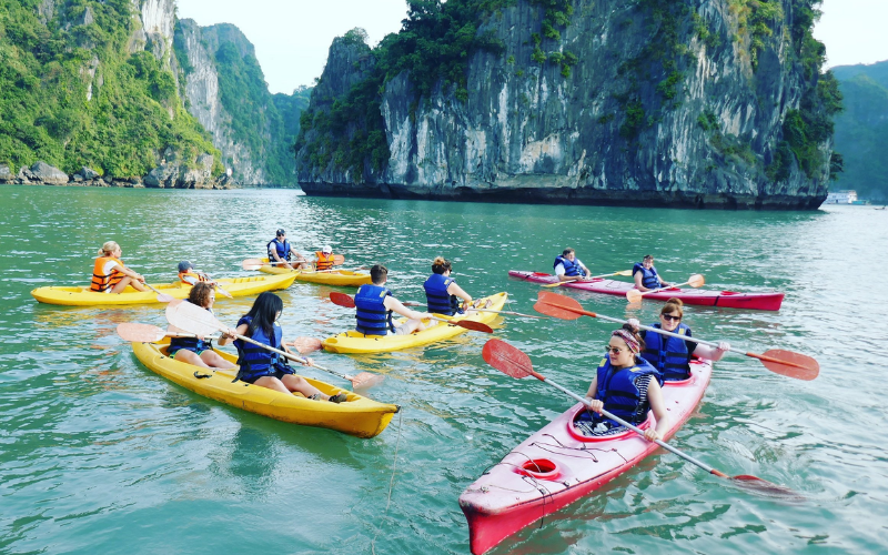 Caiaque na Baía de Halong▪️ Seu segundo dia no cruzeiro pela Baía de Halong começará com uma aula de Tai Chi de 20 minutos, para respirar o ar fresco e começar o dia de maneira revigorante.