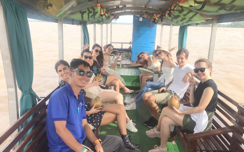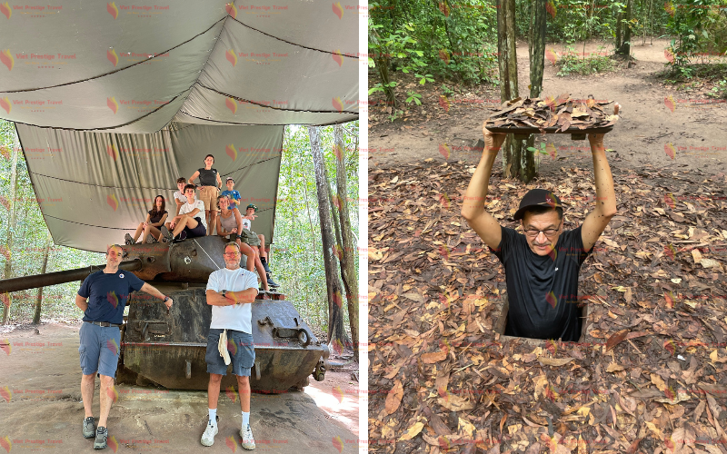 Turistas da empresa Viet Prestige Trave em Túneis de Cu Chi▪️ Hoje, vamos explorar o Delta do Mekong, começando por um passeio de barco até a Ilha Thoi Son, para ouvir música tradicional e conhecer uma fazenda de abelhas e uma fábrica de doces de coco. À tarde, seguiremos para Can Tho e visitaremos o Pagode Vinh Trang.