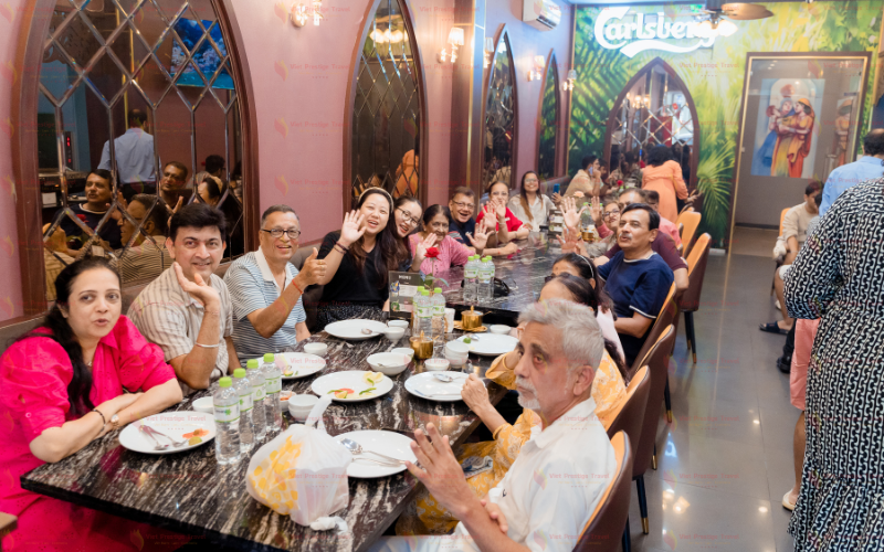 Turistas da empresa Viet Prestige Travel em Hanói▪️ Pela manhã, após o café da manhã, a equipe do cruzeiro irá buscá-lo às 8h e seguiremos para o porto de Baía de Halong, em uma viagem de cerca de 3 horas. Ao chegar, você fará o check-in e será recebido a bordo com uma bebida de boas-vindas e orientações, seguido de um almoço no salão de refeições.