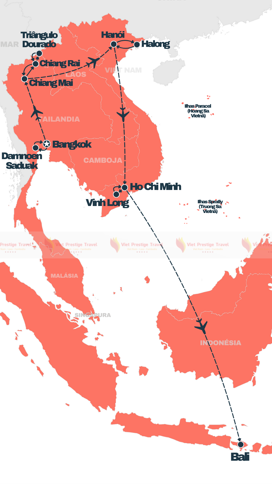 Cidade de Ho Chi Minh - Da Nang - Hoi An - Hanói - Ninh Binh - Baía de Halong - Bangkok - Kanchanaburi - Ayutthaya - Khao Yai - Chiang Mai - Krabi - Munduk - Seminyak