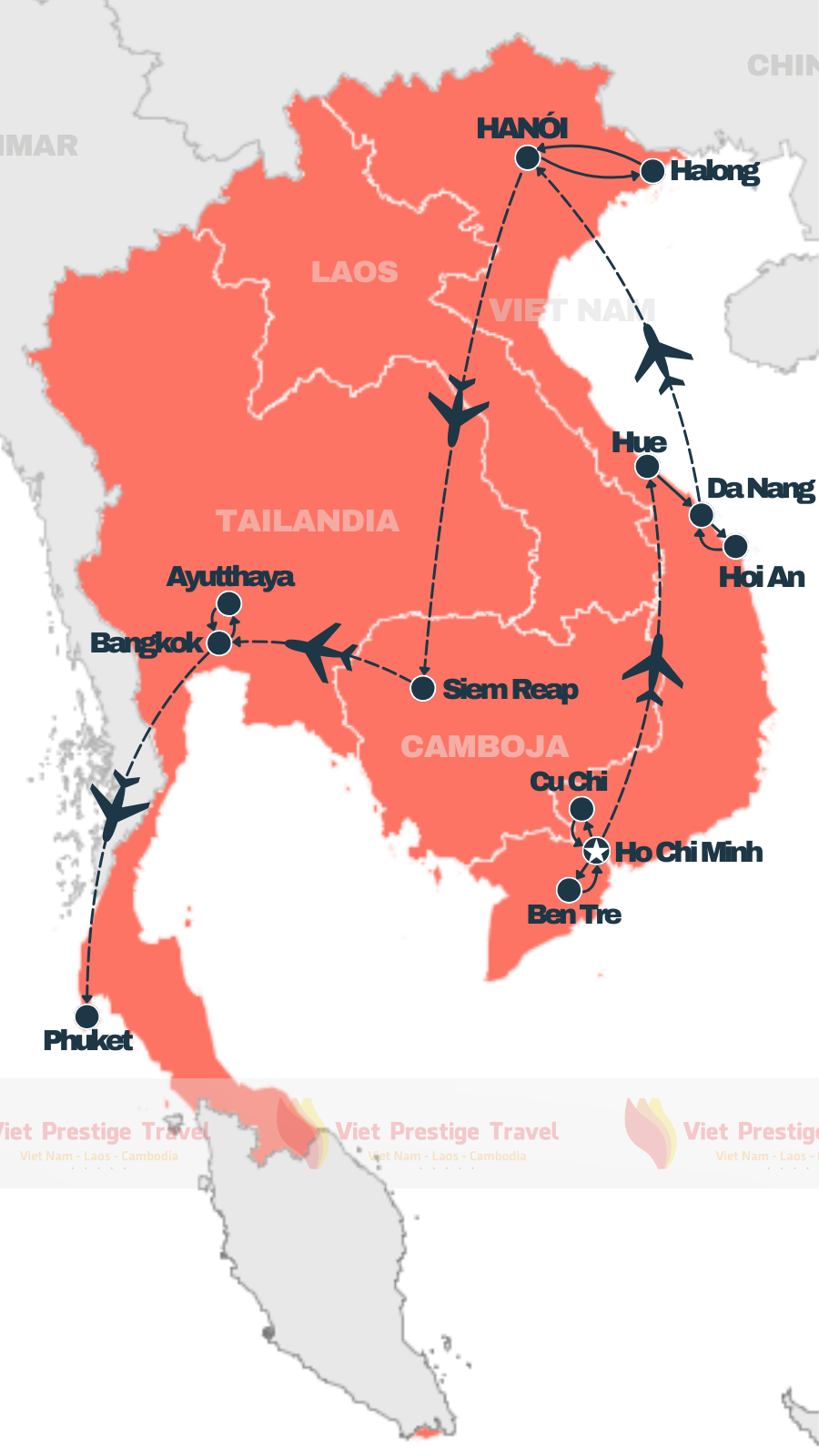 Hanói - Ninh Binh - Baía de Halong - Hue - Hoi An - Da Nang - Siem Reap - Bangkok - Ayutthaya - Chiang Mai - Phuket