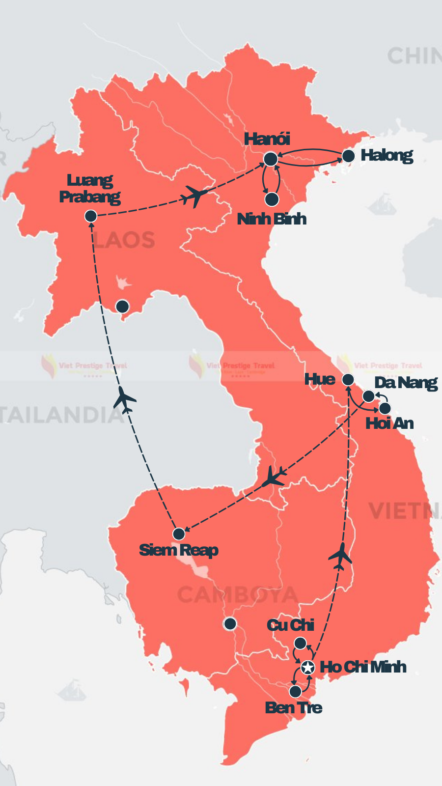 Siem Reap - Luang Prabang - Hanói - Baía de Halong - Hue - Hoi An - Cidade de Ho Chi Minh - Delta do Mekong - Cu Chi