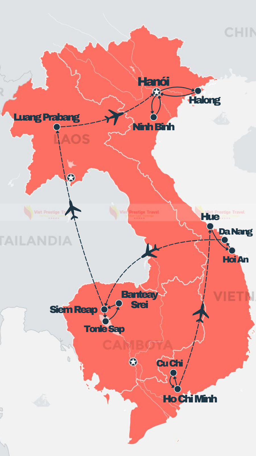 Siem Reap - Luang Prabang - Hanói - Baía de Halong - Hue - Hoi An - Cidade de Ho Chi Minh - Delta do Mekong - Cu Chi