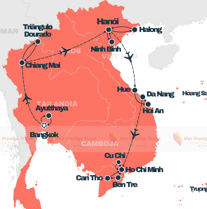 Hanói - Baía de Halong - Da Nang - Hoi An - Cidade de Ho Chi Minh - Cu Chi - Delta do Mekong - Bangkok - Ayutthaya - Phuket