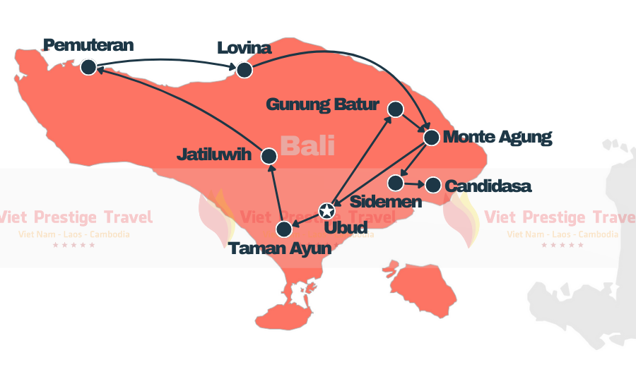 ▪️ Em seguida, siga para o norte da ilha, passando pela região de Jatiluwih com suas terraços de arroz classificados como Patrimônio Mundial pela UNESCO. Faça uma parada em Bedugul, uma vila de montanha às margens do lago Bratan. Descubra o famoso templo de Ulun Danu Beratan que fica às margens do lago.