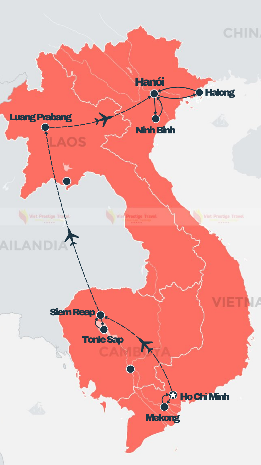 Hanói - Baía de Halong - Hue - Hoi An - Cidade de Ho Chi Minh - Phnom Penh - Siem Reap - Luang Prabang - Vienciana