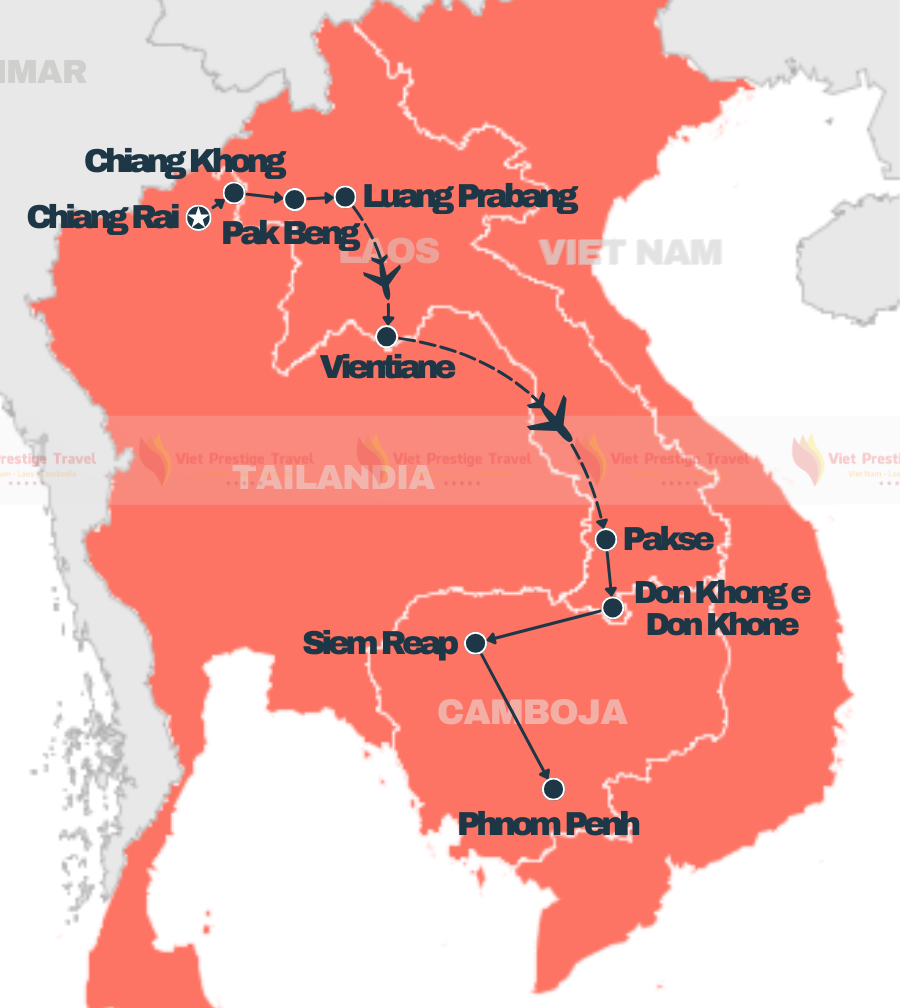 Hanói - Baía de Halong - Hoi An - Hue - Ho Chi Minh - Delta do Mekong - Siem Reap - Tonle Sap - Bangkok - Chiang Rai - Triângulo Dourado - Chiang Mai - Phuket - Singapura
