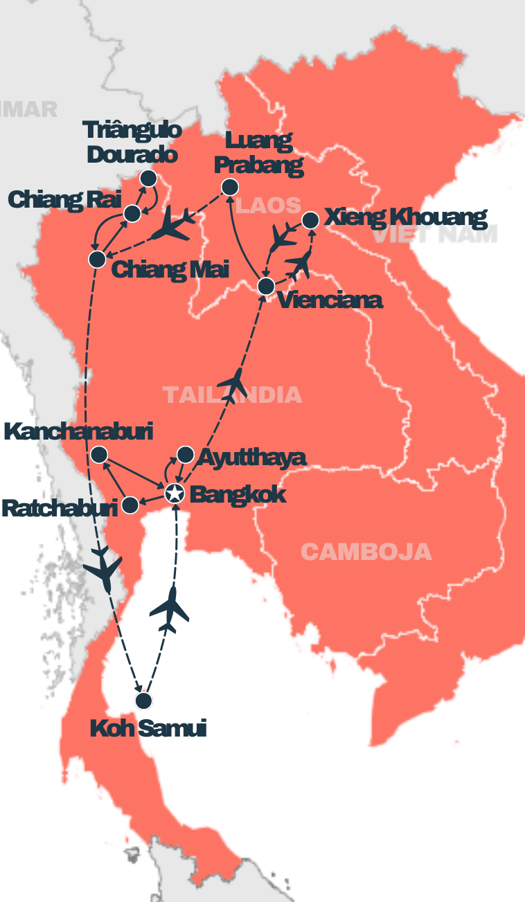 Explorando uma jornada única de Bangkok, a vibrante capital, passando pelas tranquilas regiões de Kanchanaburi e Ayutthaya. Em seguida, descobrindo a rica herança cultural de Vientiane, com seus destaques como That Luang e Patuxai, seguido pela grandiosidade de Xieng Khuang e pela serenidade de Luang Prabang no Laos. Experimente a elegância de Chiang Mai e Chiang Rai antes de relaxar nas lendárias praias de Koh Samui.