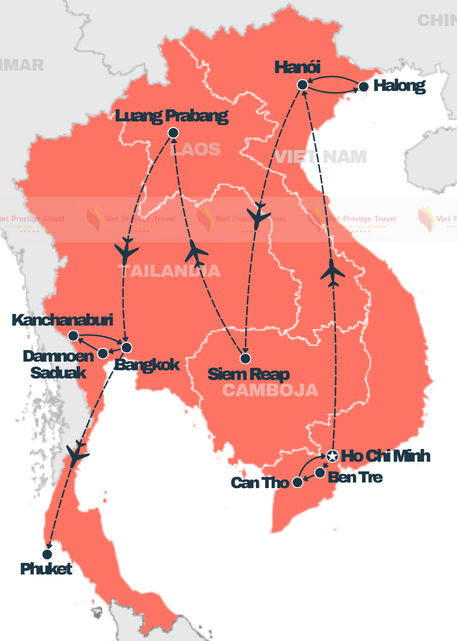 Bangkok - Vienciana - Luang Prabang - Siem Reap - Phnom Penh - Chau Doc - Can Tho - Cidade de Ho Chi Minh - Túneis de Cu Chi - Da Nang - Hoi An - Hanói - Baía de Halong