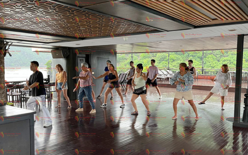 Baía de Halong▪️ Acorde cedo e participe de Tai Chi no convés superior ou simplesmente relaxe e aproveite o nascer do sol sobre as imponentes ilhas da baía, uma visão imperdível! Desfrute de uma xícara de café ou chá pela manhã antes de sair para visitar uma caverna maravilhosa na Baía de Halong.
