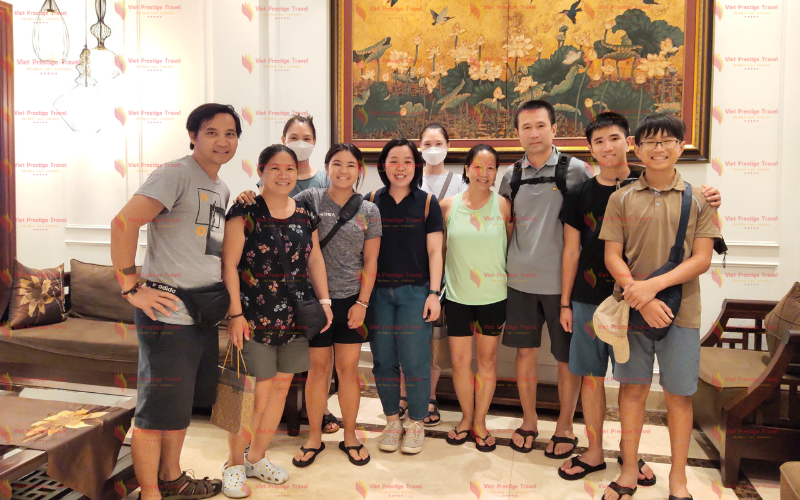 Imagem dos clientes da empresa Viet Prestige Travel na baía de Halong ▪️ Café da manhã no hotel e tempo livre até o traslado para o aeroporto de Hanói para um voo de 1h20min para Da Nang. Chegada e traslado para Hoi An, uma cidade histórica listada como Patrimônio Mundial da UNESCO.