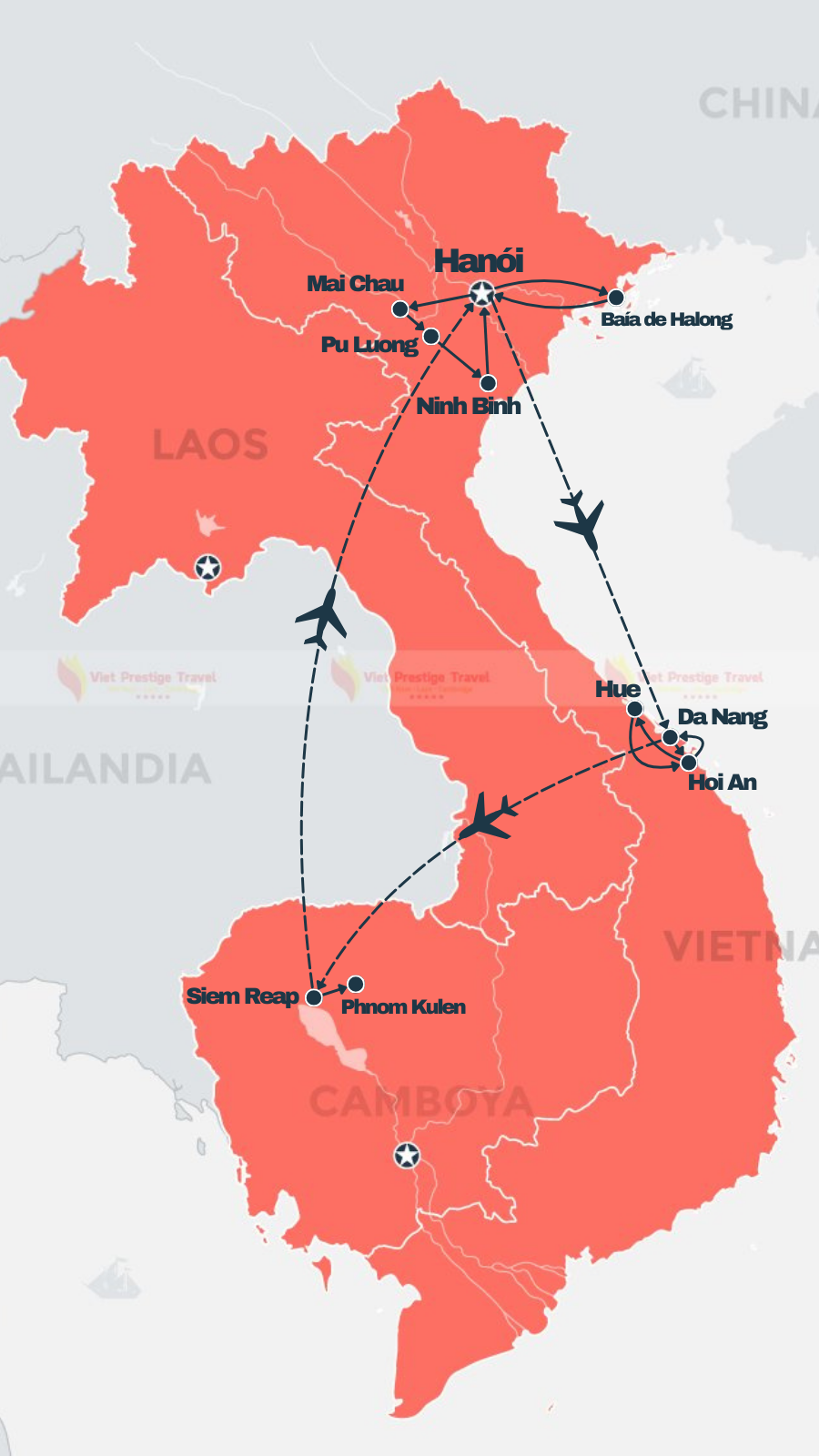 Siem Reap - Ta Prohm - Tonle Sap - Phnom Penh - Can Tho - Cidade de Ho Chi Minh - Cu Chi - Da Nang - Hoi An - Hue - Hanói - Baía de Halong