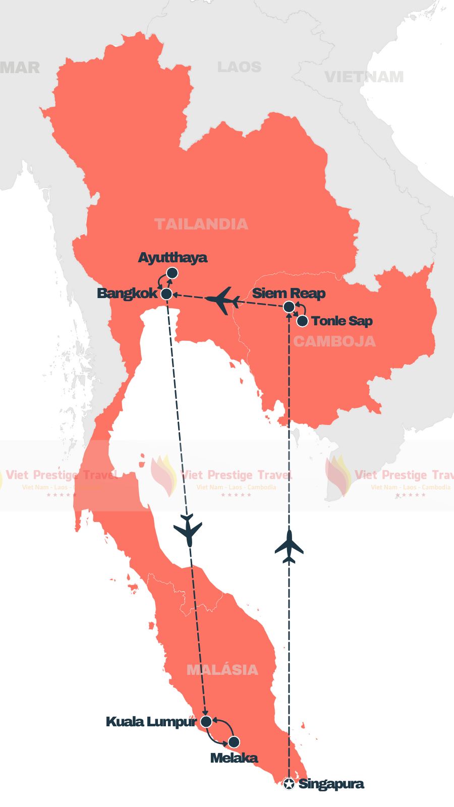 Explore uma emocionante jornada por Singapura, Siem Reap, Bangkok, Ayutthaya, Kuala Lumpur e Melaka. Descubra templos antigos, palácios magníficos e a cultura vibrante desses destinos. Desfrute de aventuras inesquecíveis e mergulhe na beleza exótica do Sudeste Asiático.