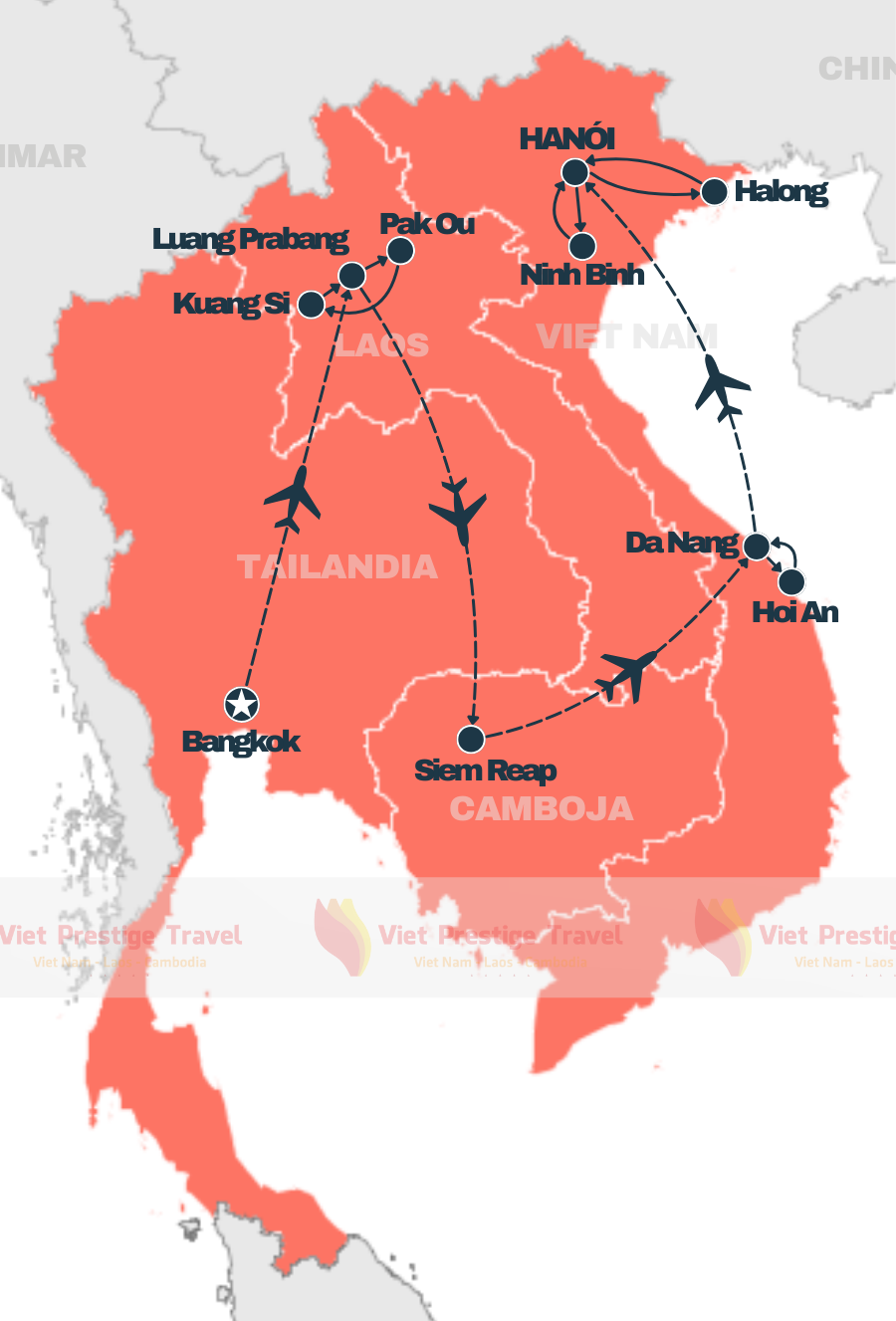Bangkok - Chiang Mai - Chiang Rai - Hanói - Baía de Halong - Cidade de Ho Chi Minh - Delta do Mekong - Siem Reap - Luang Prabang