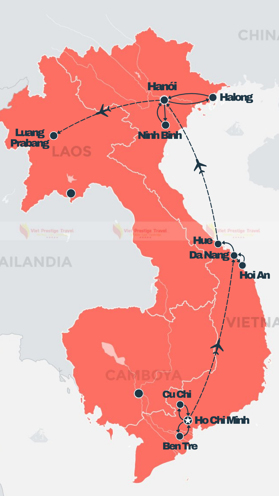 Ho Chi Minh - Túneis de Cu Chi - Da Nang - Hoi An - Hue - My Son - Hanói - Halong - Pu Luong - Vientiane - Luang Prabang