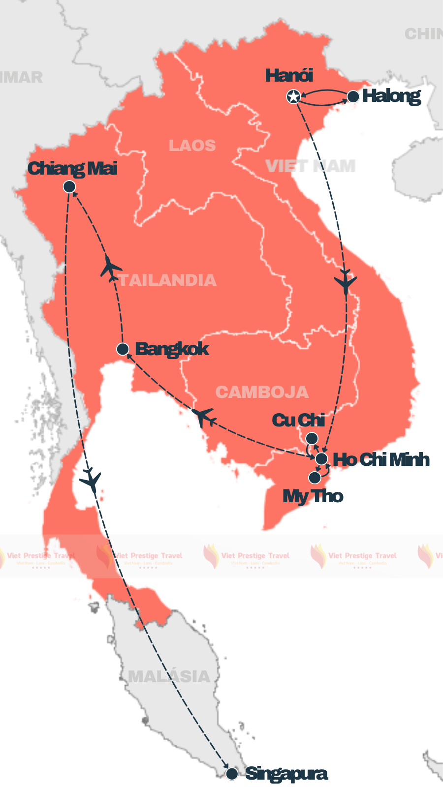 Desfrute de uma viagem maravilhosa por Vietnã, Tailândia e Singapura durante 14 dias com a Viet Prestige Travel, uma empresa local confiável no Vietnã. Explore Hanói, Baía de Halong, Cidade de Ho Chi Minh, Bangkok, Chiang Mai e Singapura, descobrindo a riqueza cultural e gastronômica de cada destino. Reserve agora e aproveite esta experiência inesquecível com descontos especiais!