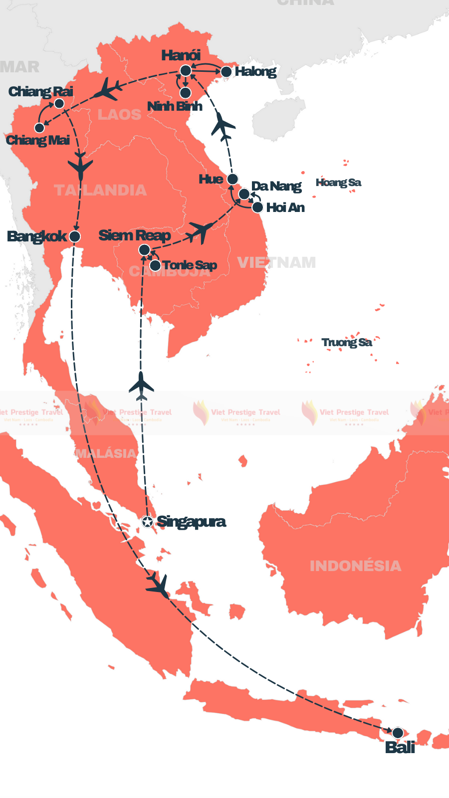 Hanói - Baía de Halong - Hoi An - Hue - Ho Chi Minh - Delta do Mekong - Siem Reap - Tonle Sap - Bangkok - Chiang Rai - Triângulo Dourado - Chiang Mai - Phuket - Singapura