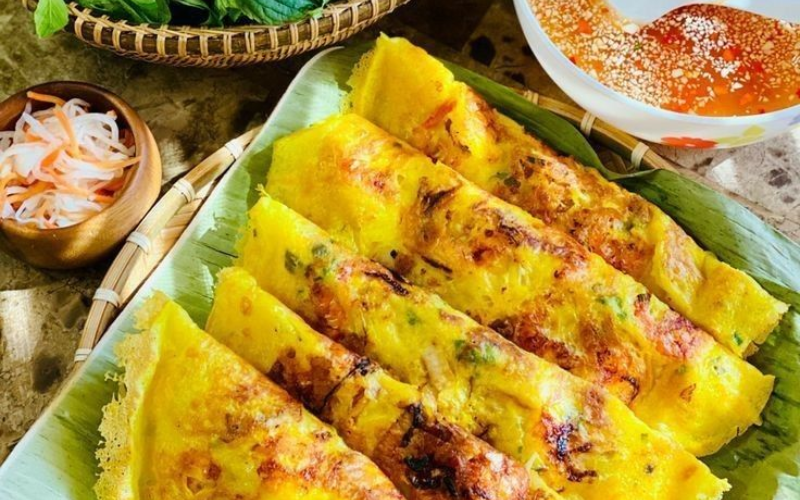 Maior que a versão de outras regiões, o bánh xèo do Delta tem massa crocante e recheio generoso de camarão, carne e broto de feijão. Enrolado em folhas verdes e servido com molho agridoce, transmite o espírito simples e alegre da culinária local.