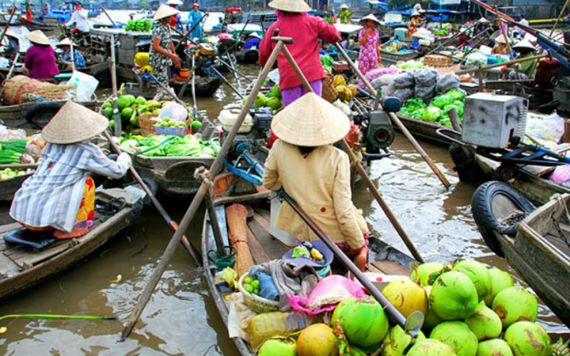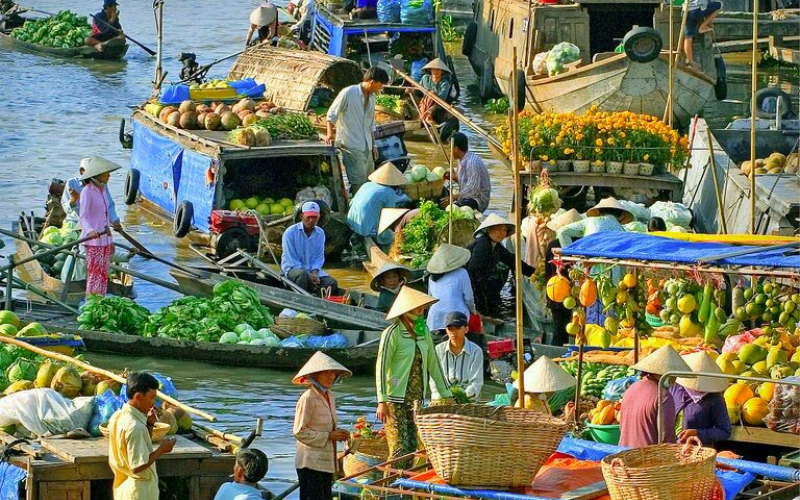 Os mercados flutuantes são uma das expressões mais autênticas da vida no Delta do Mekong. Ao amanhecer, barcos e canoas se reúnem nos rios, transportando frutas, produtos agrícolas e pratos típicos, criando um cenário animado, porém tranquilo.
